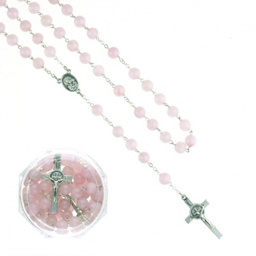 Różaniec wykonany z kamienia naturalego, zapakowany w plastikowe pudełko.