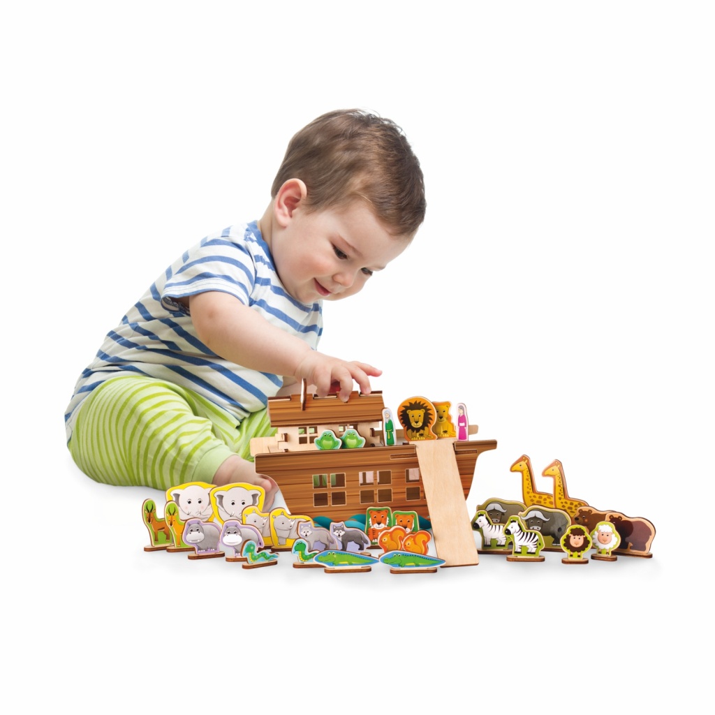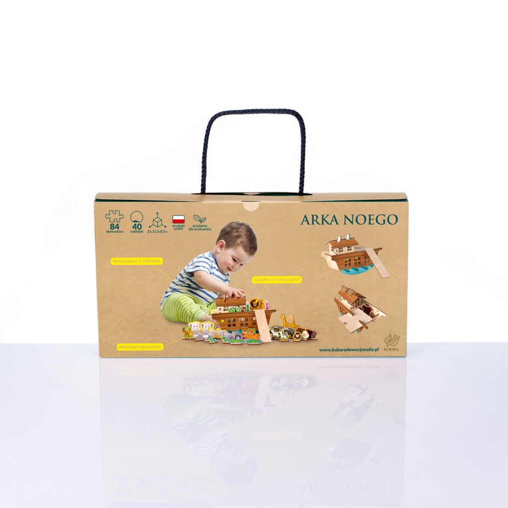 Arka Noego to zabawka edukacyjna, przeznaczona dla dzieci od piątego roku życia. Lecz młodsze maluchy, w towarzystwie swego starszego rodzeństwa lub rodziców, również świetnie będą się nią bawić. Zabawka Arka Noego, wykonana ze sklejki, składa się z 84 elementów: części statku, zwierząt oraz postaci Noego i jego żony. Zestaw to również 40 kolorowych naklejek, które ożywią całą załogę figurek. Zarówno budowa arki, jak i naklejanie naklejek to wspaniała zabawa. Gotowy statek prezentuje się niezwykle efektownie, wyzwala wyobraźnię i wiele emocji. Jest źródłem nowych doświadczeń i pozwala poznać sens biblijnej opowieści o potopie. Ta ekologiczna zabawka to doskonały prezent na Boże Narodzenie, urodziny lub Dzień Dziecka.