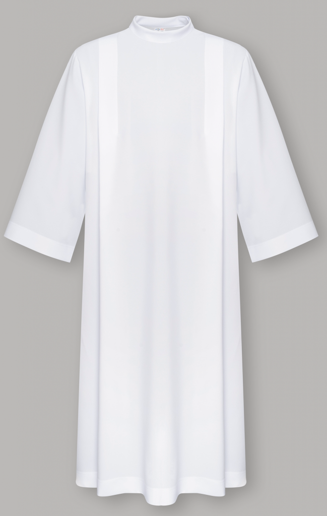Alba z tkaniny z domieszką streczu. Posiada zakładki, dzięki czemu bardzo dobrze się układa. Góra wykończona stójką z suwakiem na ramieniu