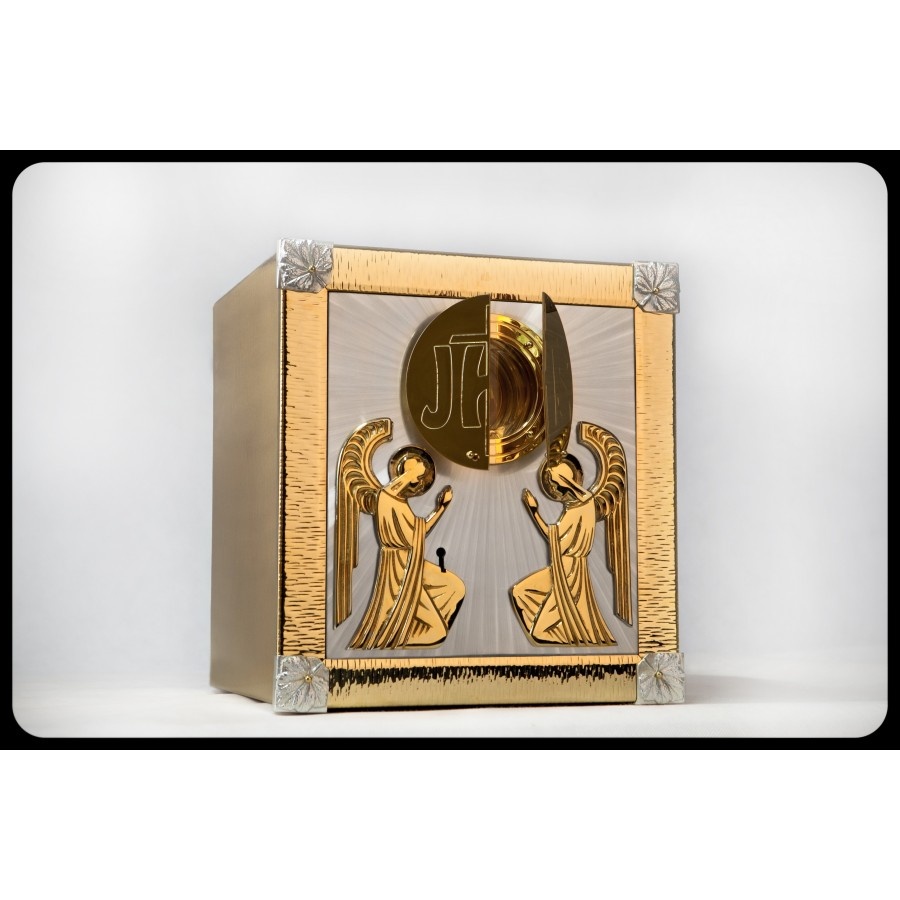 Tabernakulum wykonane wg obowiązujących standardów. Ogniotrwałe, pancerne z ryglami poziomymi i pionowymi. Aplikacje zewnętrzne zostały pozłocone, wykonane z mosiądzu metodą metaloplastyki. Wnętrze tabernakulum jest z blachy chromoniklowej lub złoconego mosiądzu / za dodatkową opłatą /. Konstrukcja stalowa składająca się z podwójnie spawanych ścian o grubości ok 3 cm. Zewnętrzna, boczna obudowa, wykonana jest ze szlifowanej blachy mosiężnej.