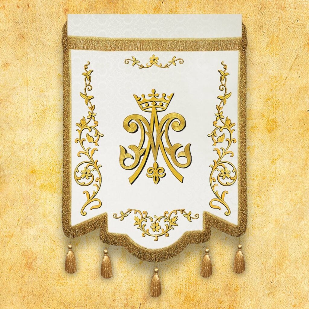 Chorągiew wykonana z tkaniny żakard w kolorze ekri, całość obszyta złotymi frędzlami.