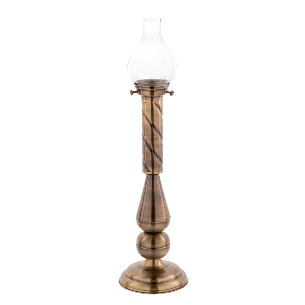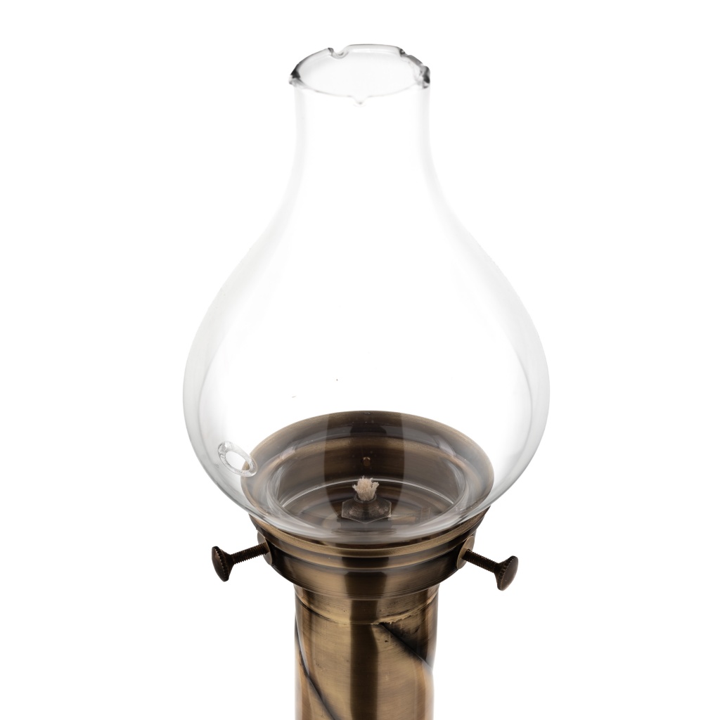Lichtarz z polerowanego mosiądzu na wysoki połysk i zabezpieczane specjalnym verniksem, posiada wkład olejowy z regulacją o pojemności 180ml i klosz o wysokości 16cm