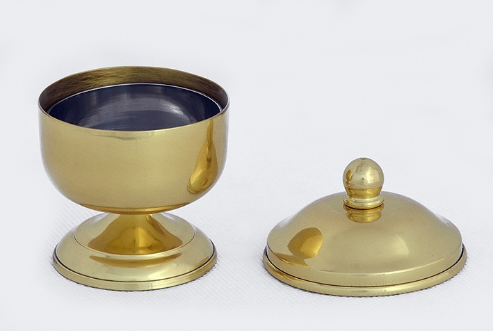Z blachy mosiężnej, zabezpieczonej specjalnym lakierem. W komplecie pojemnik ze stali nierdzewnej.