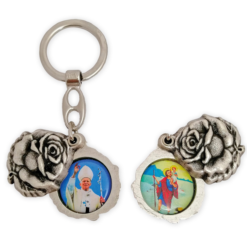 Wewnątrz wklejka z wizerunkiem Św. Krzysztofa i papieża Jan Paweł II.